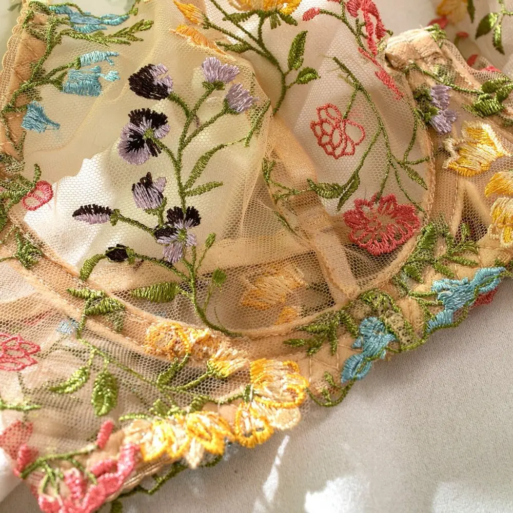 2-Piece Embroidery Lingerie Set Women Underwear Sexy Floral Sheer Wireless Bra Boho Bra Panty Set