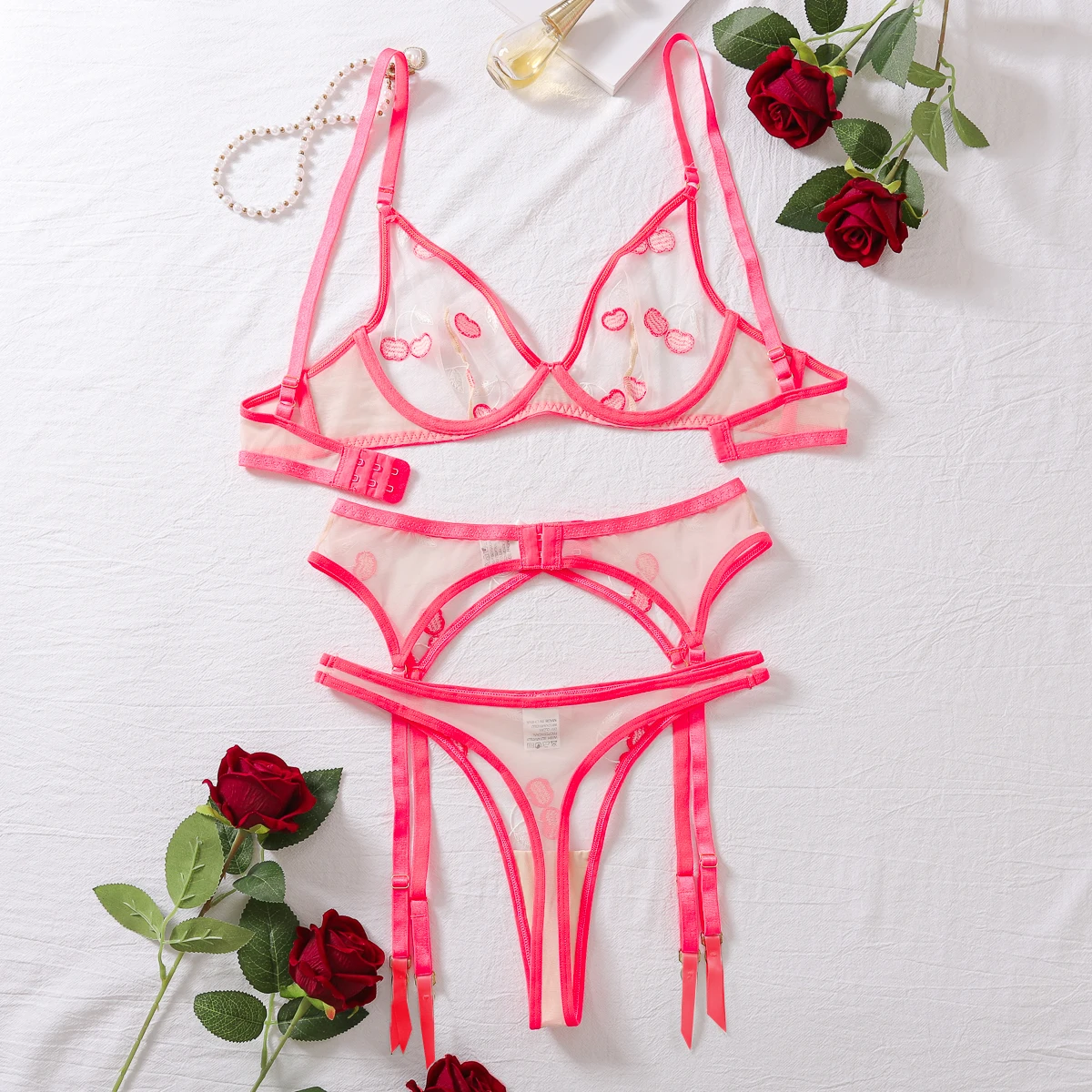 2024 Explosive Hot Sale Cute Girls Embroidery Mesh see-through Erotic Suit Sexy Lingerie Panties three-piece Set