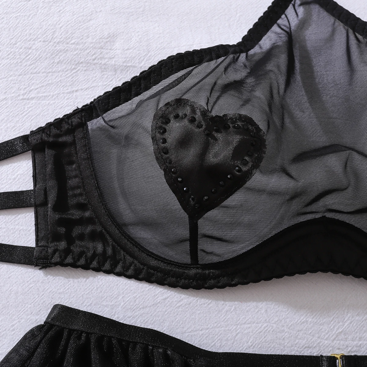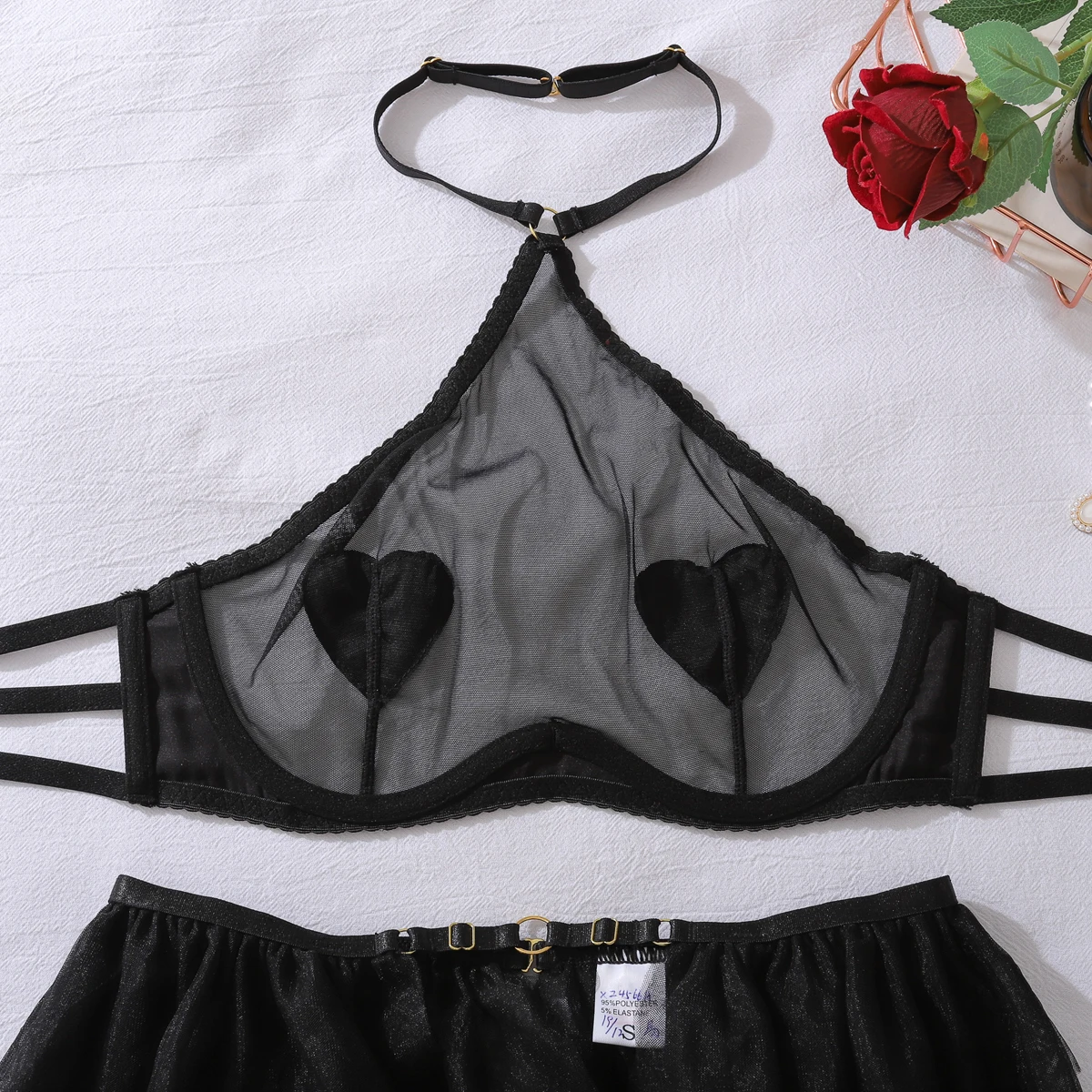 2025 New three-point Love Mesh Perspective Hanging Neck with Silk Socks Sexy Underwear Four piece Set