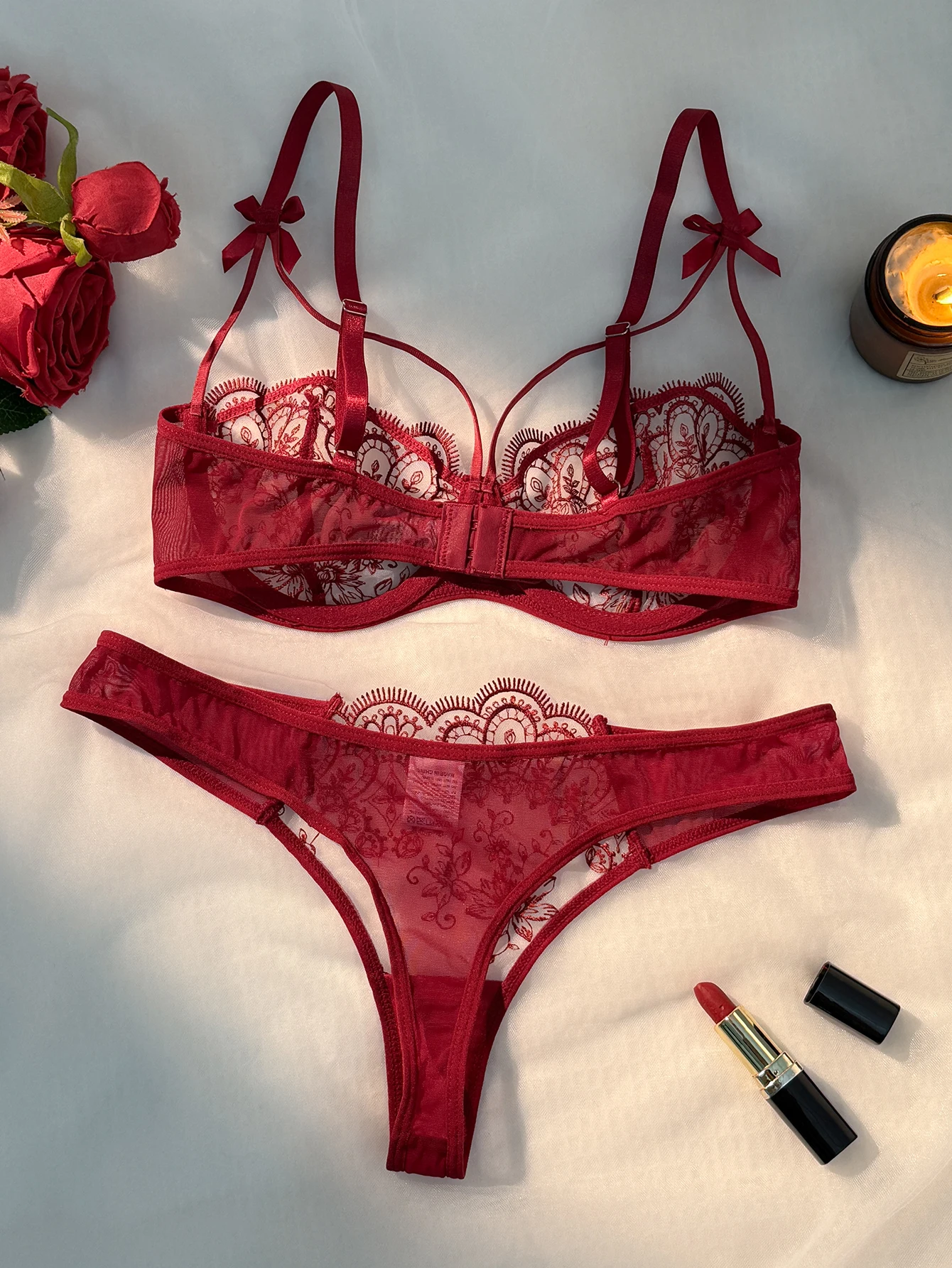 2pcs Women’s Bra Set Sexy Lace Mesh Lingerie Set Ultra Thin Breathable Comfortable Lightweight Bow Semi Transparent Lingerie Set