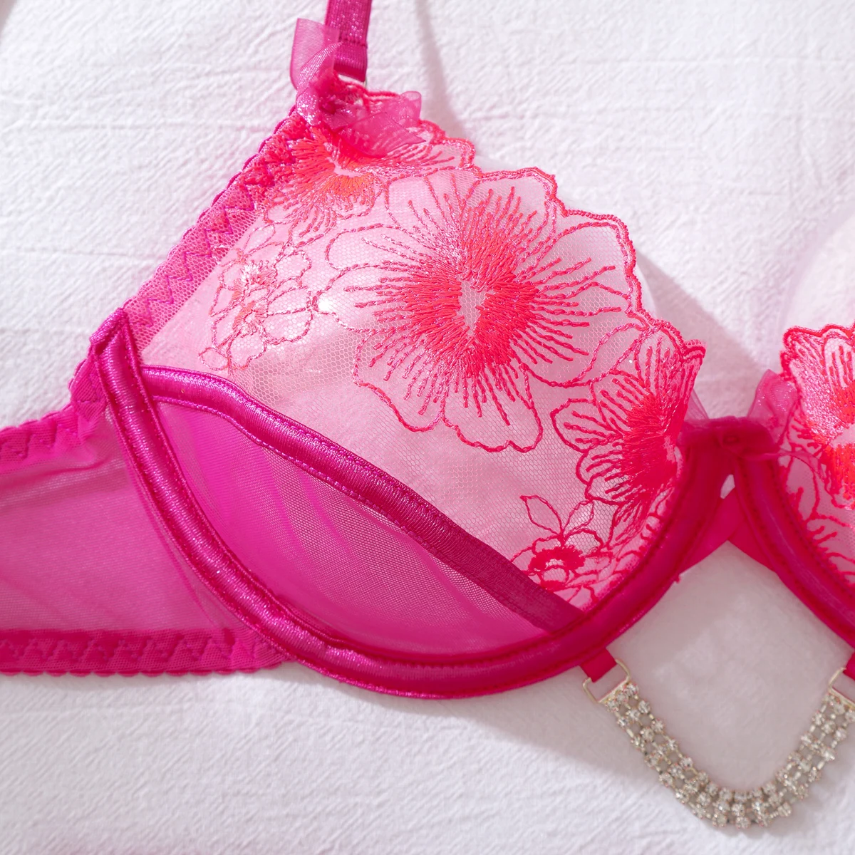 Bright Diamond Chain Accessories Flower Embroidery Perspective Splicing Gather Pure Desire Bow Sexy Underwear Four Piece Set