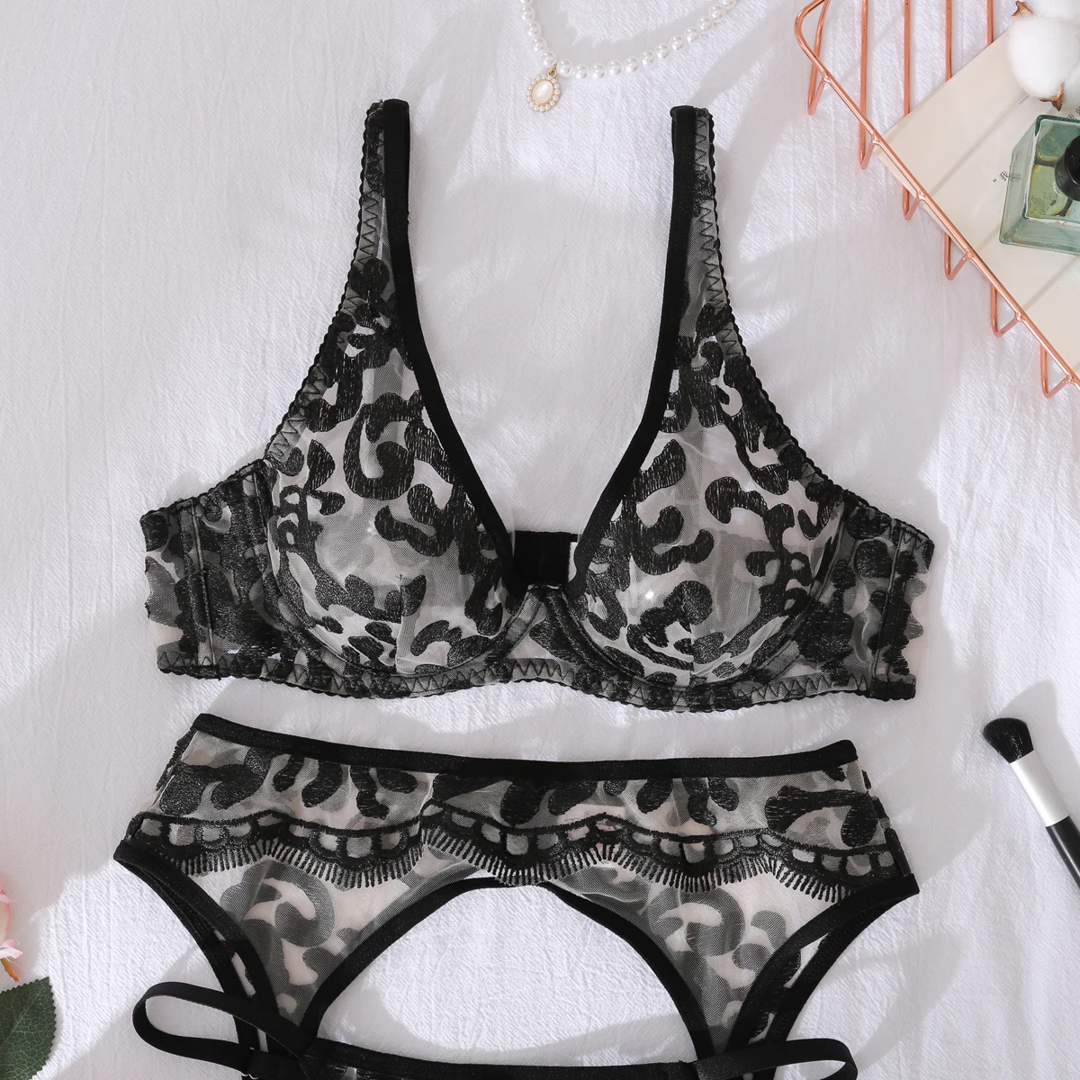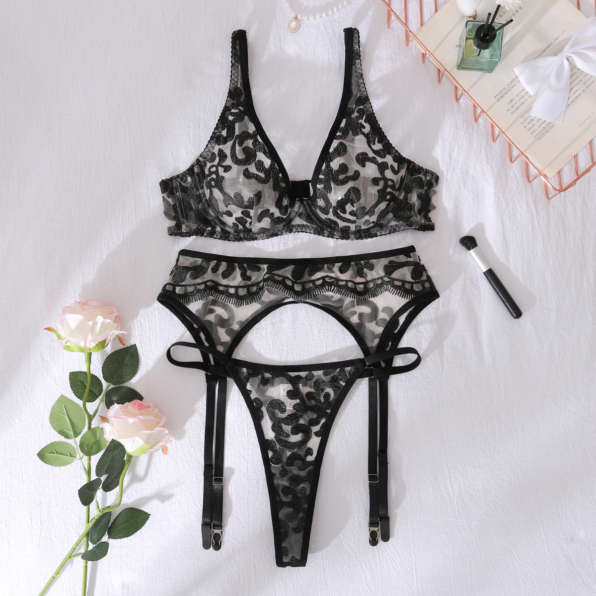 Dear Lingerie 2025 New Deep V Embroidered Perspective Thin Shaped Sexy Underwear Split Set Three Piece Set