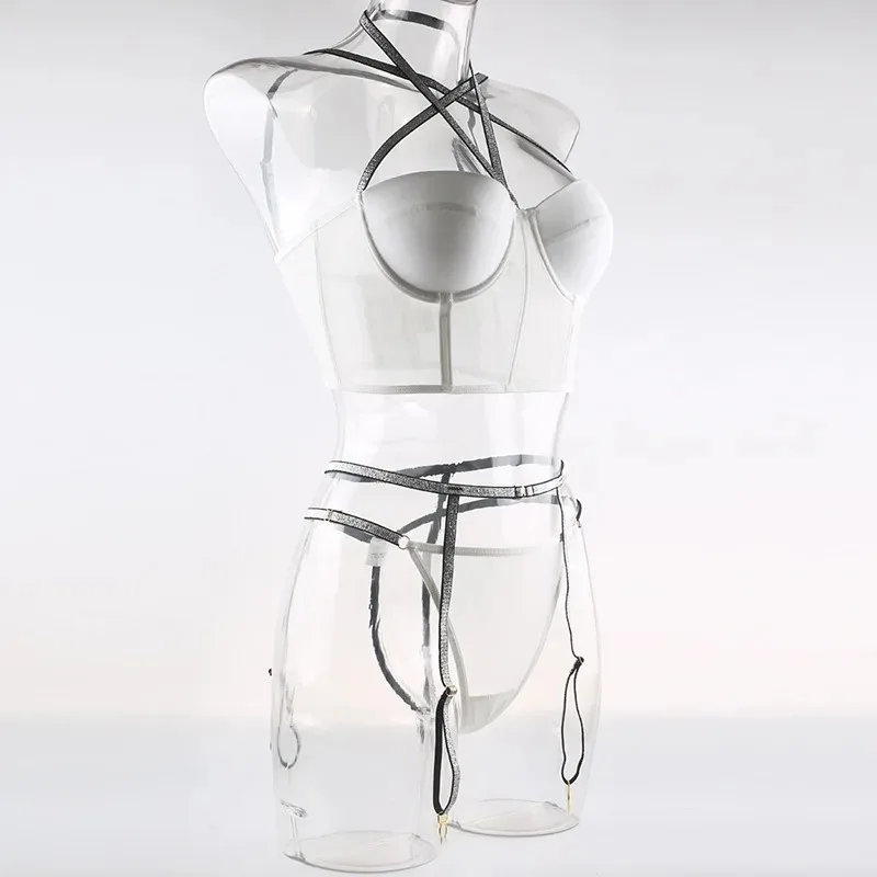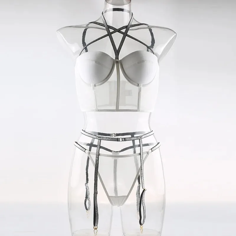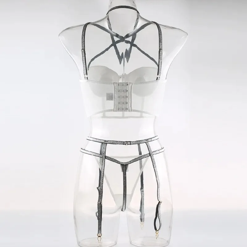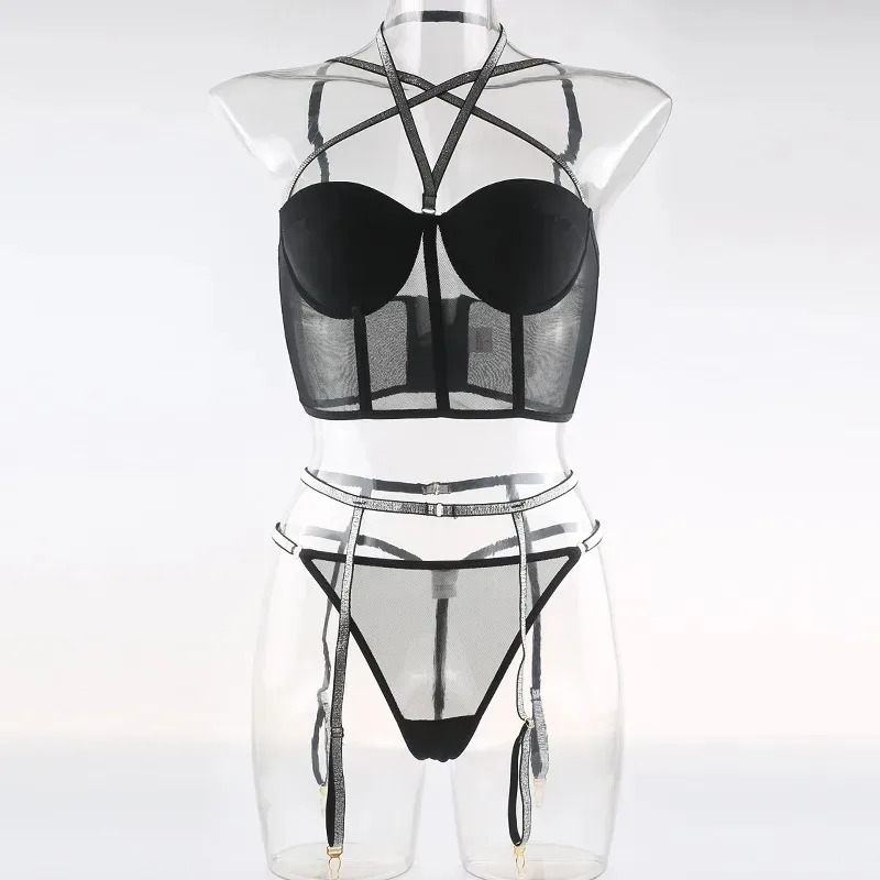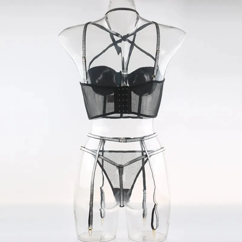 DearLingerie 3 Piece Halter Bra Set Women Long Underwire Push Up Lingerie + Mesh Sexy Thong Set Lingerie Set