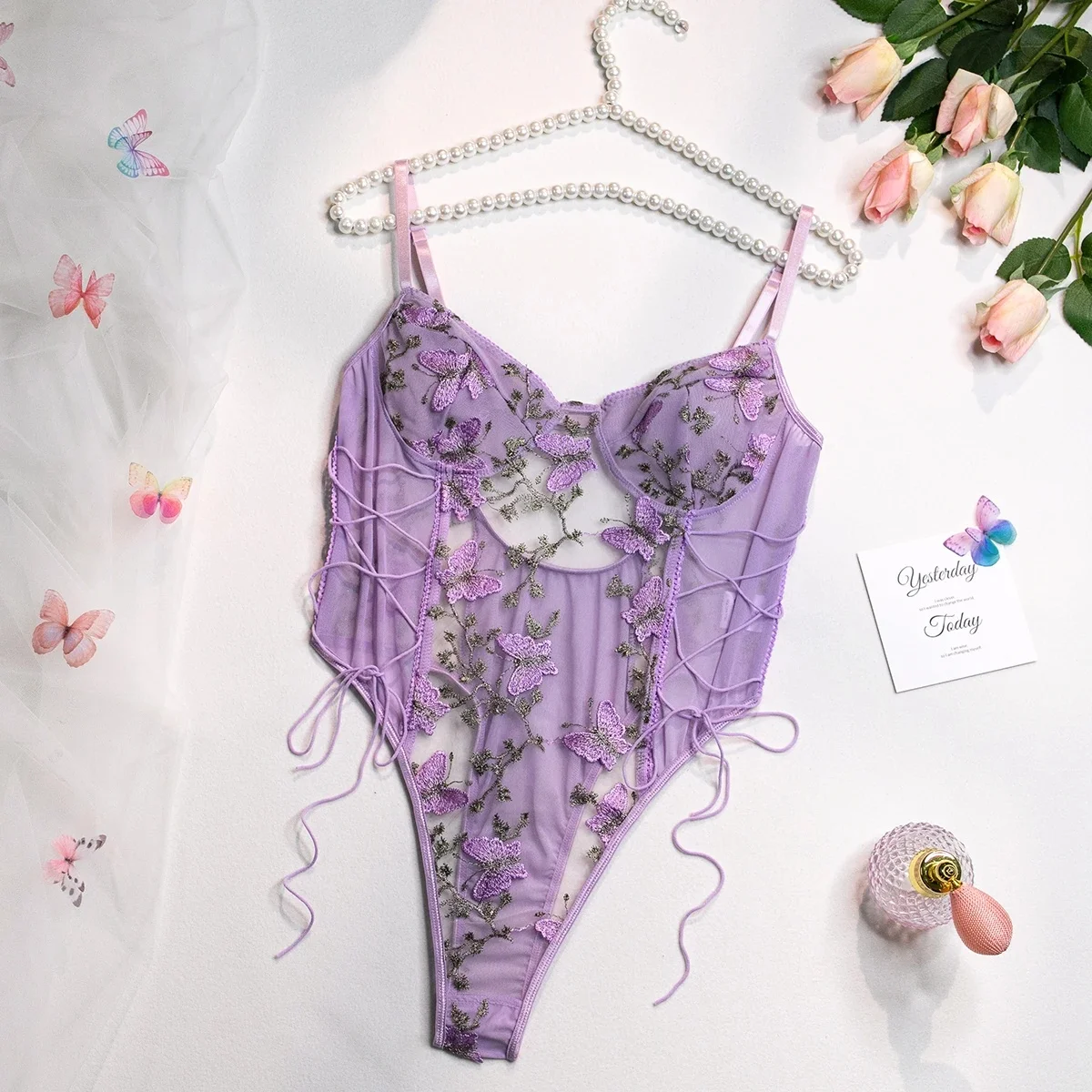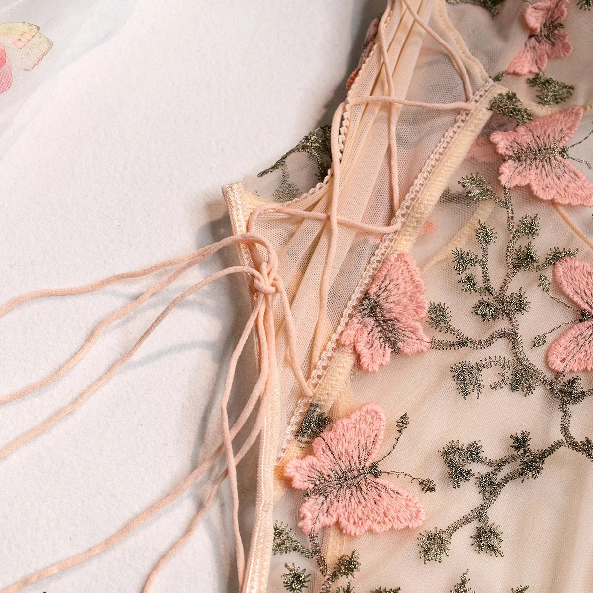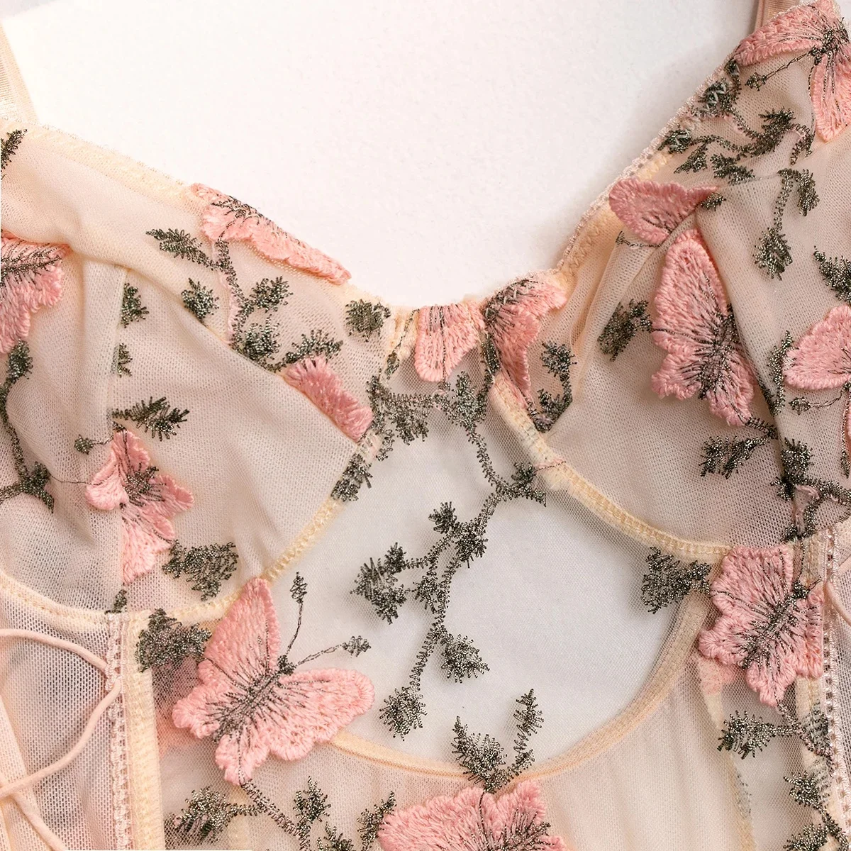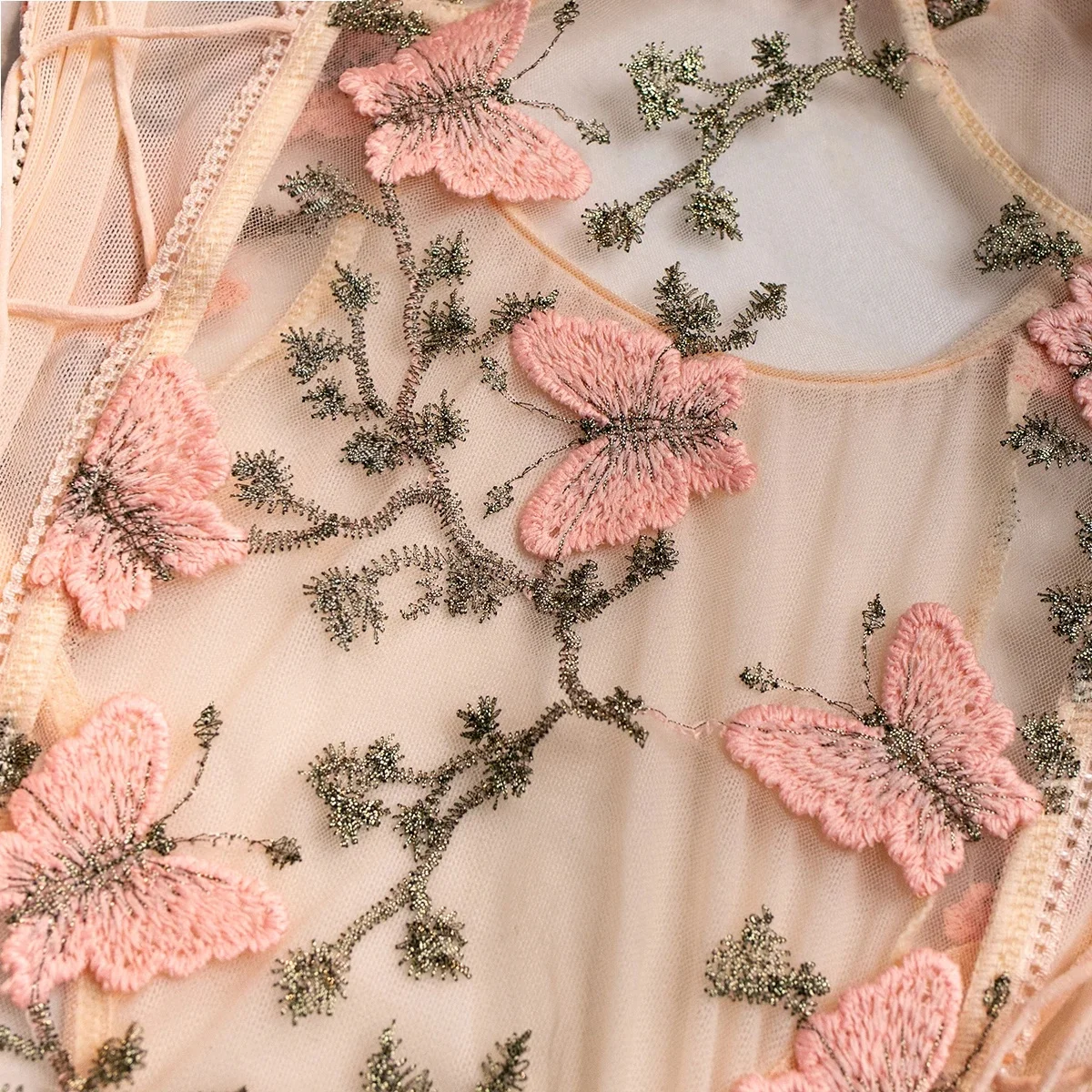 DearLingerie Boho Butterfly Embroidery Mesh Bodysuit Women Transparent Lace Up Sexy Bodysuit Body Femme