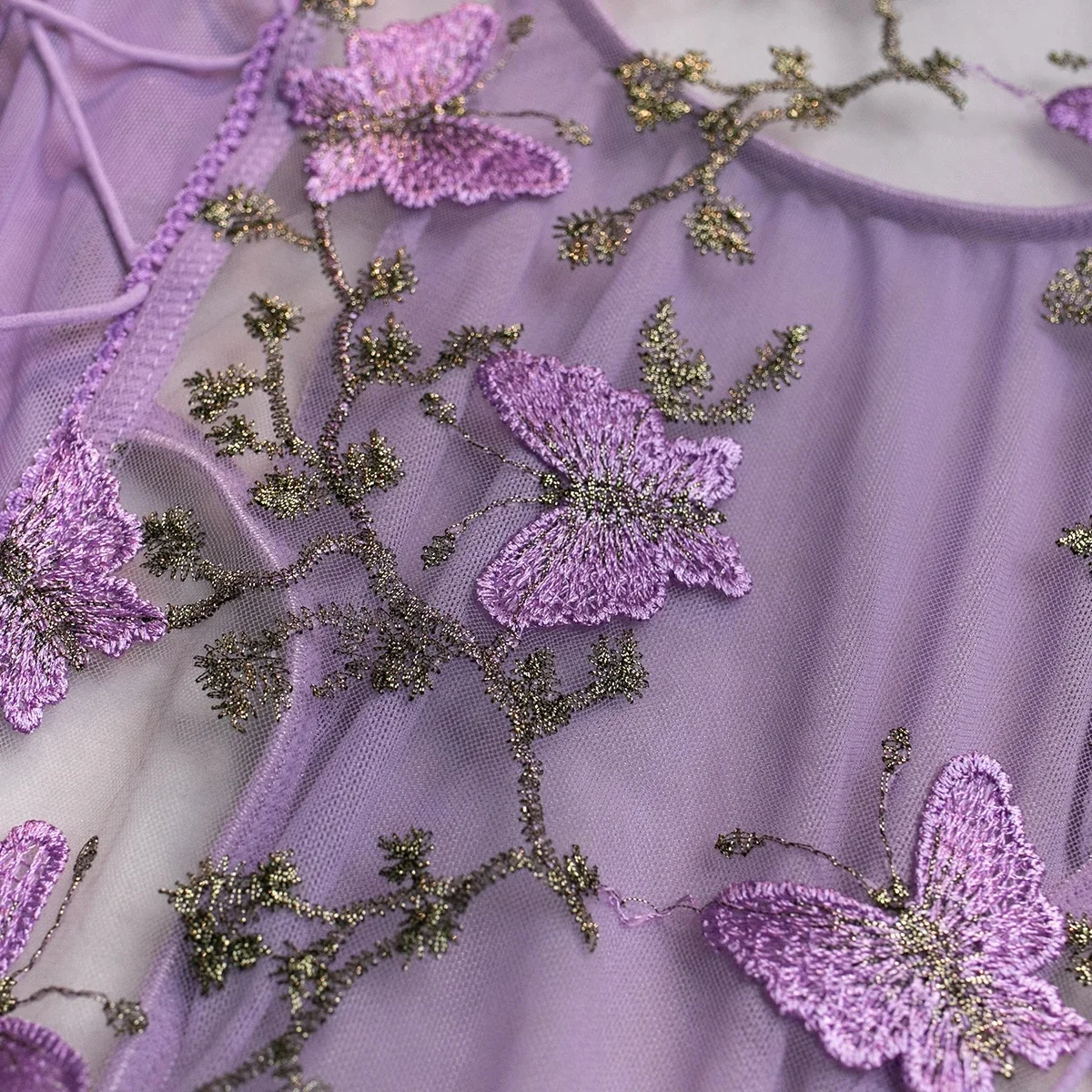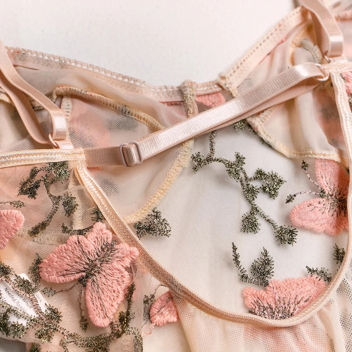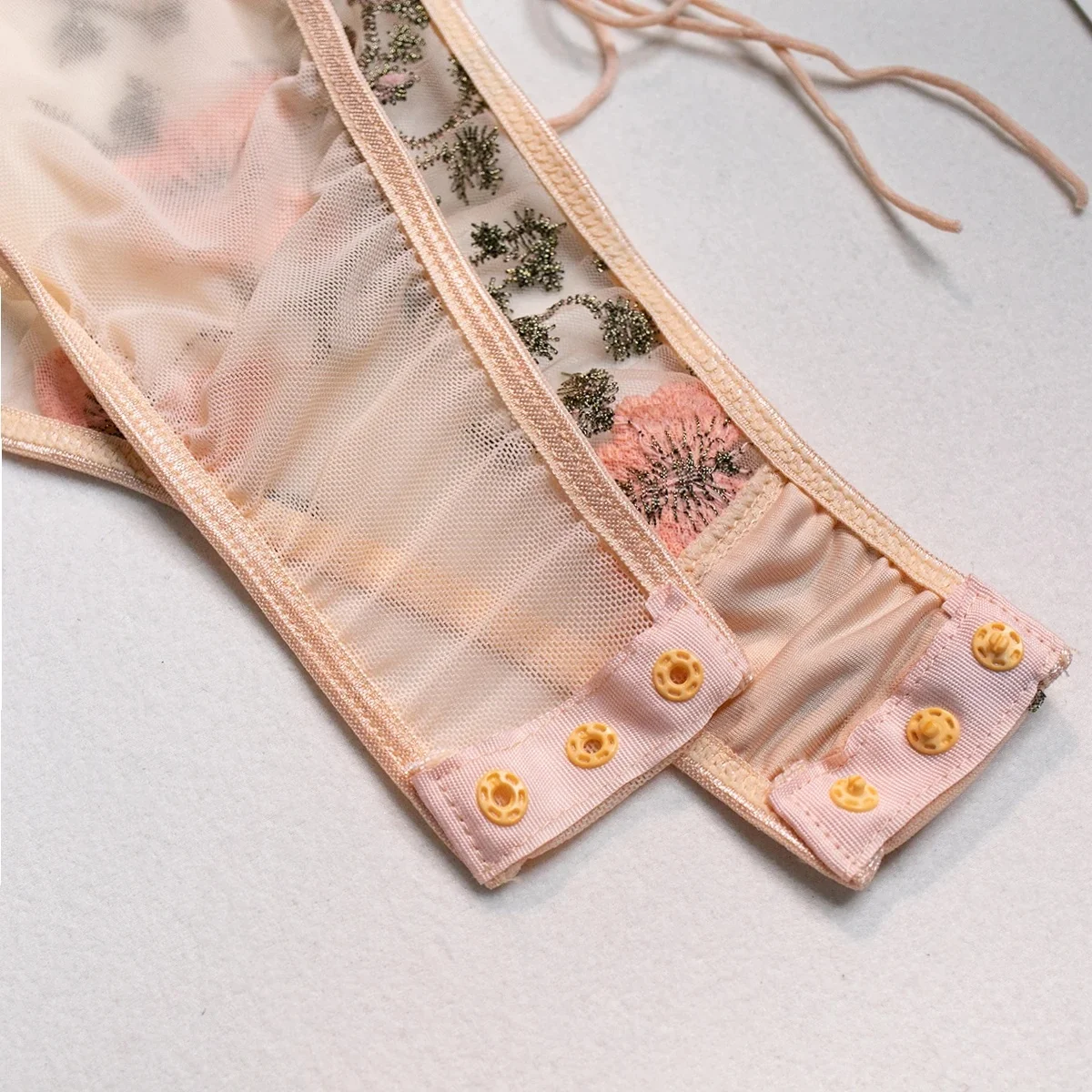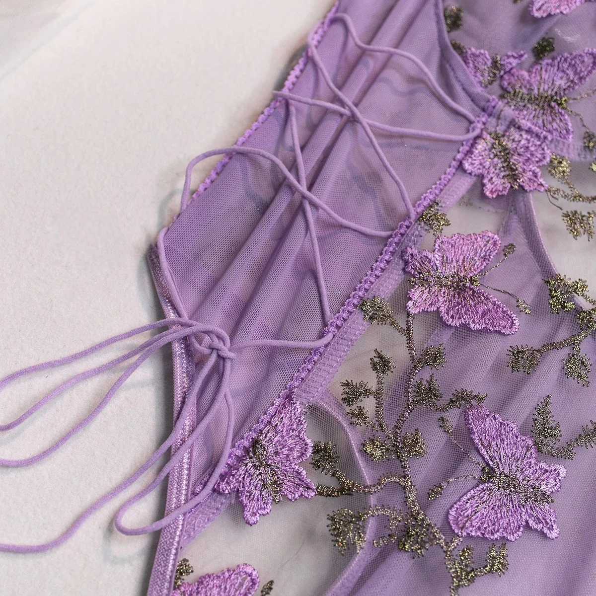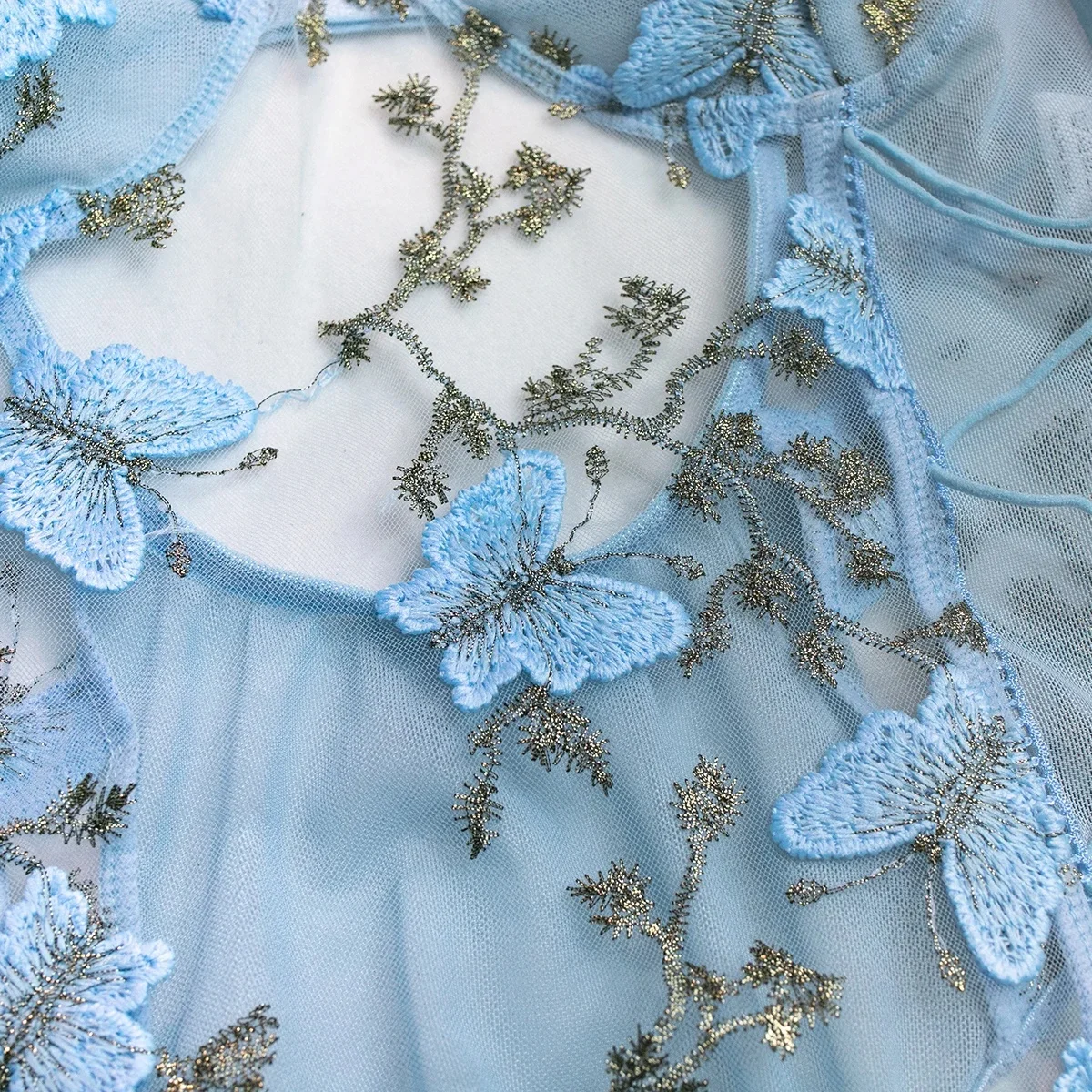 DearLingerie Boho Butterfly Embroidery Mesh Bodysuit Women Transparent Lace Up Sexy Bodysuit Body Femme