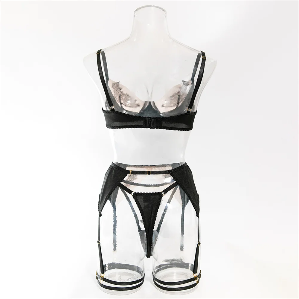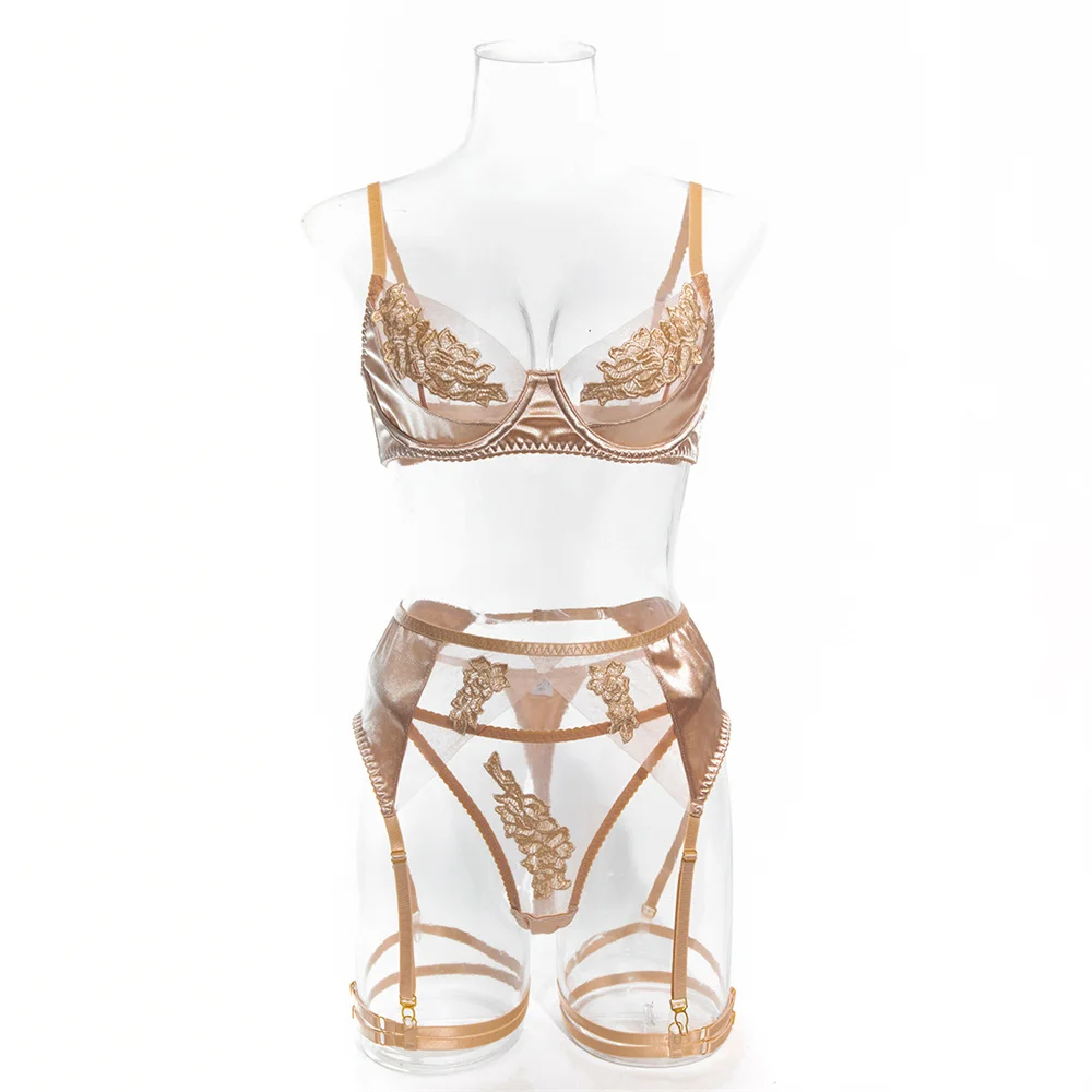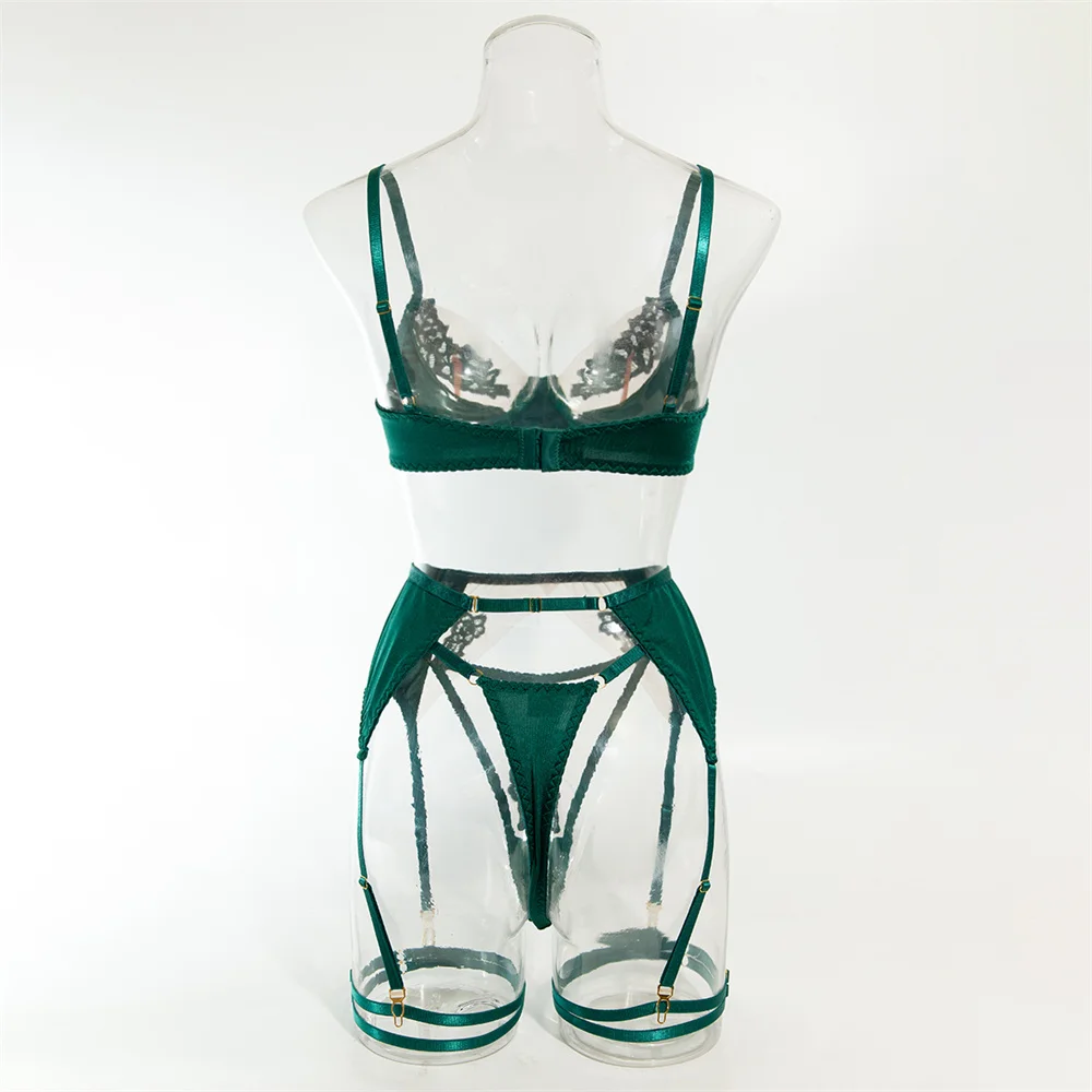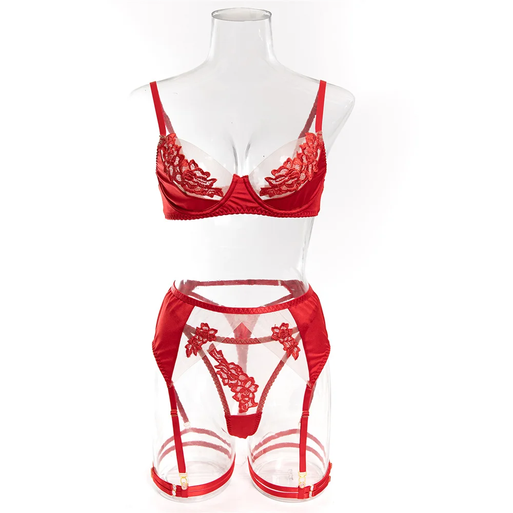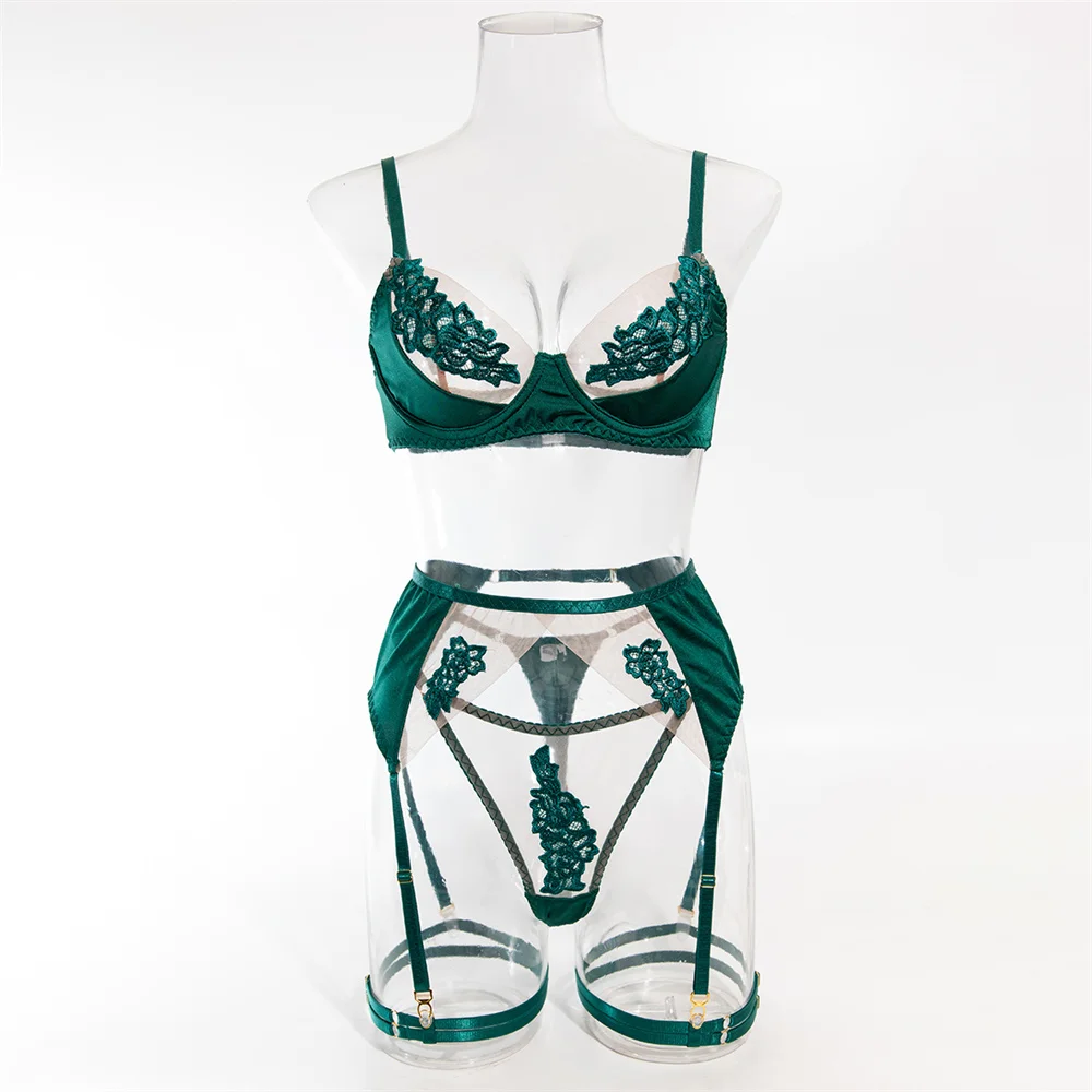 DearLingerie Fancy Flower Embroidery Lingerie 4 Pcs Sets Sexy Mesh Patchwork Transparent Bras And Thongs Garter Suit Delicate Bilizna