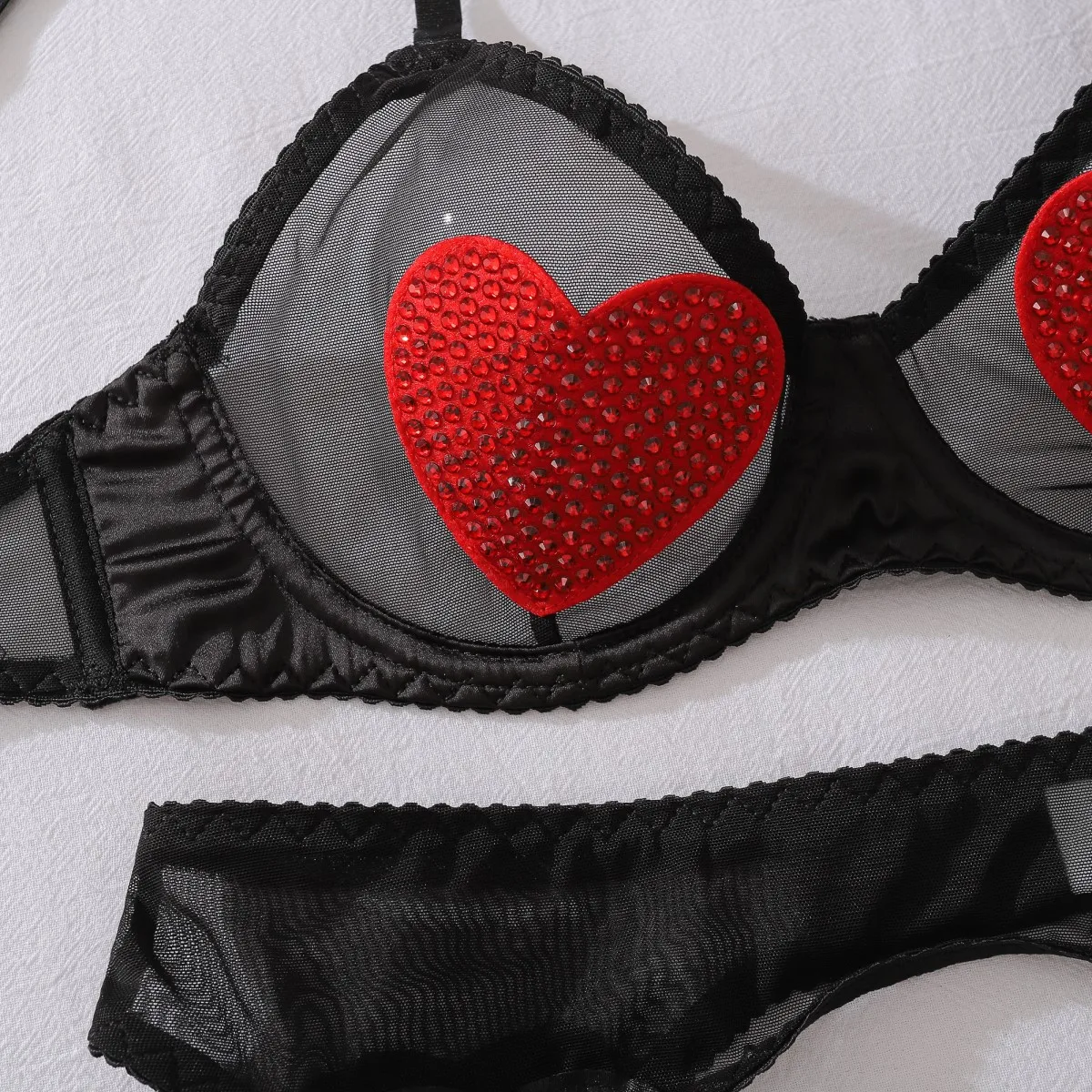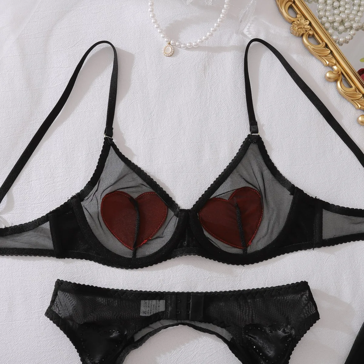 European and American hot girl perspective love decoration hollow body shaping sexy underwear split set with stockings