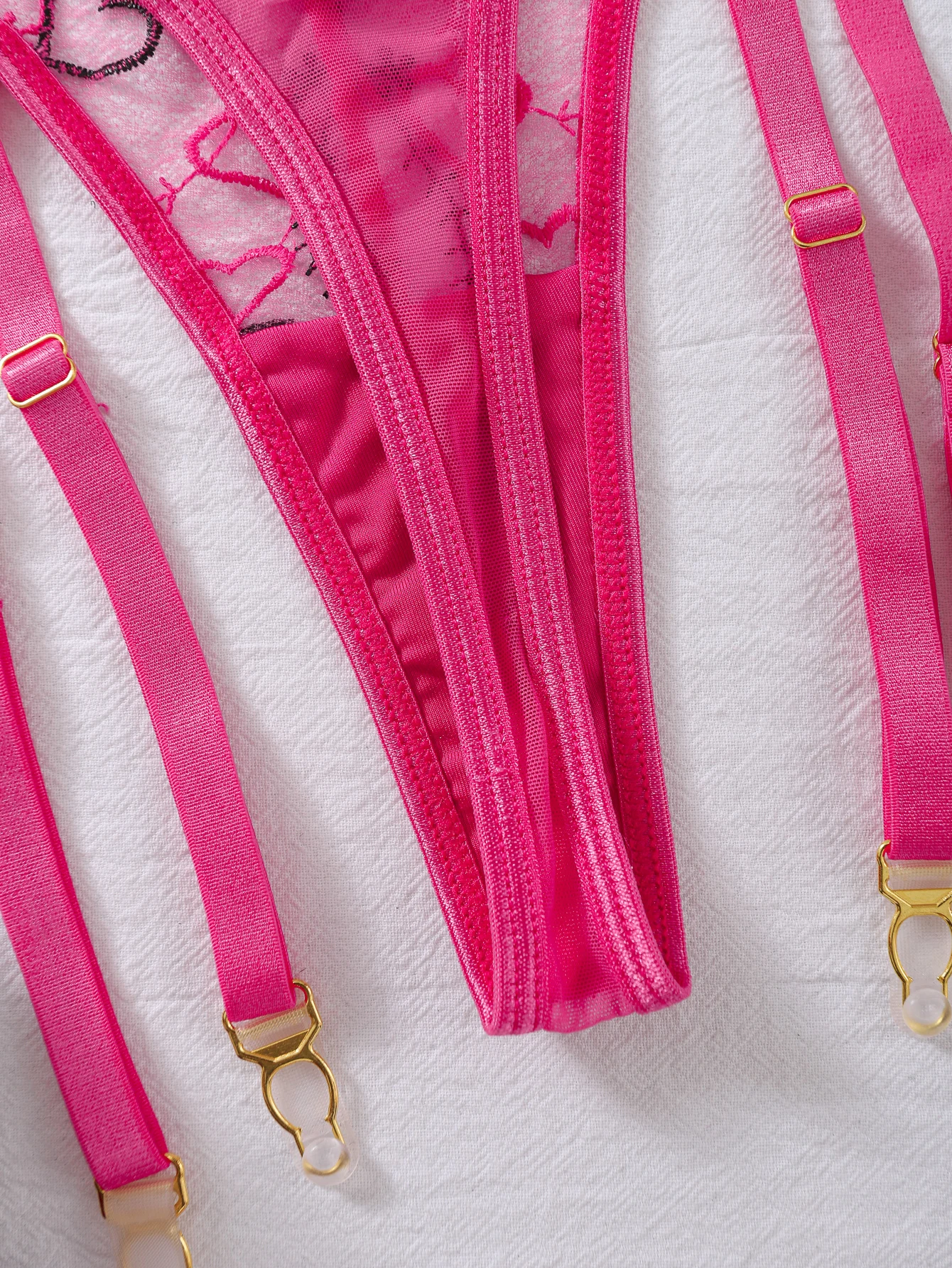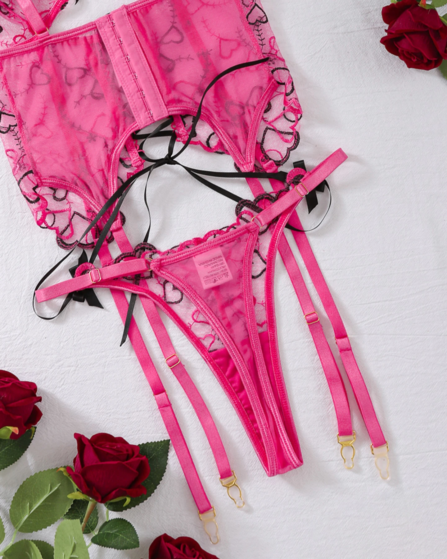 Mesh Erotic Women’s Lingerie Set Lace See Through Sexy Heart Shape Embroidery Underwear and Thong Porn three-piece Set