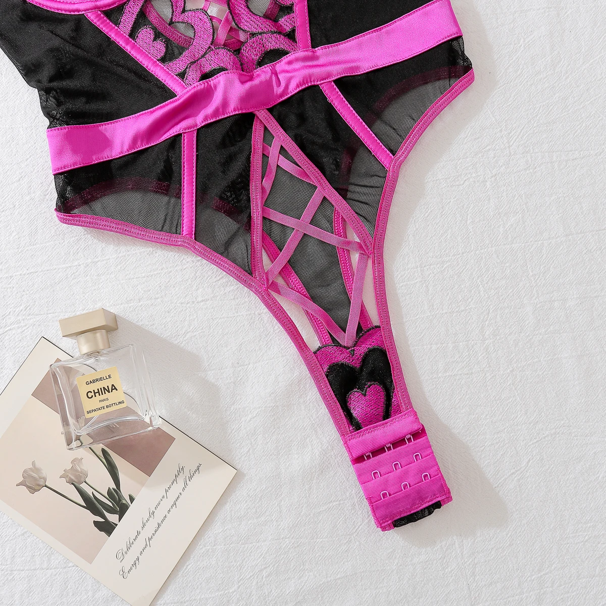 New Luxury Embroidered Heart-shaped Erotic Seductive Lingerie Transparent Ultra-thin Sexy Mesh Slim Fit Jumpsuit