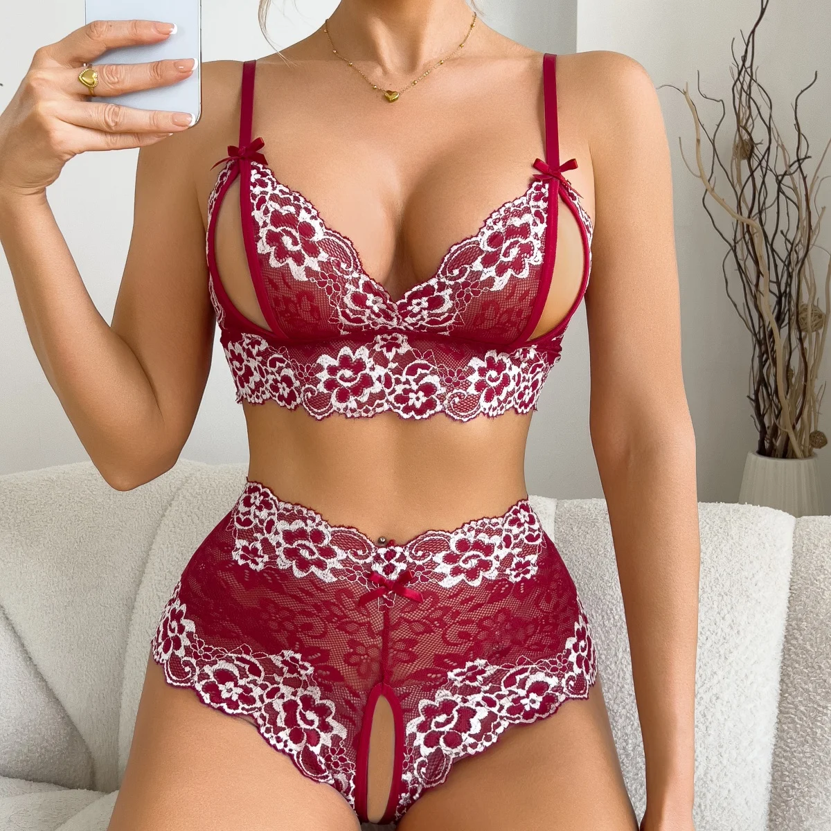 Red Open Bra Sexy Adult Lingerie For Women Hollow Transparent Flower Lace Underwear Sets Brassiere And Crotchless Panty 2 Piece