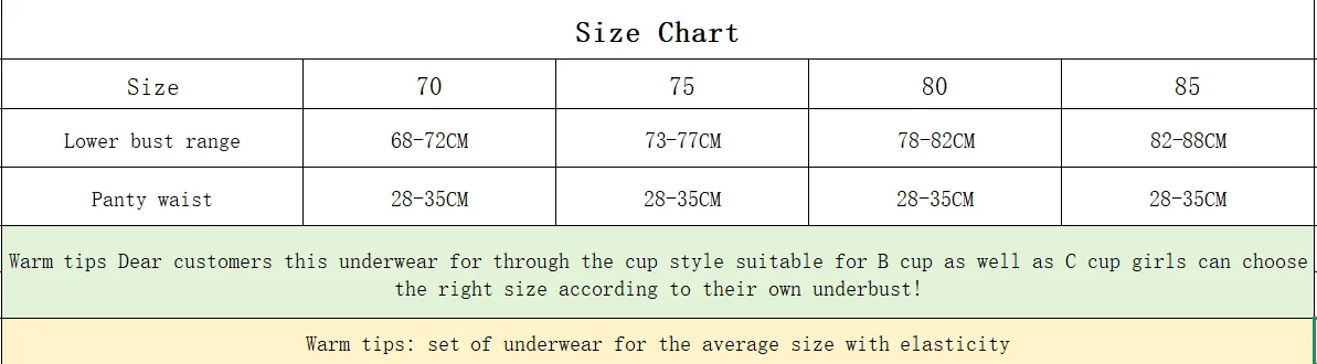 | Cup Size | 70(Fits BC cups), 75(Fits BC cups), 80(Fits BC cups), 85(Fits BC cups) |
