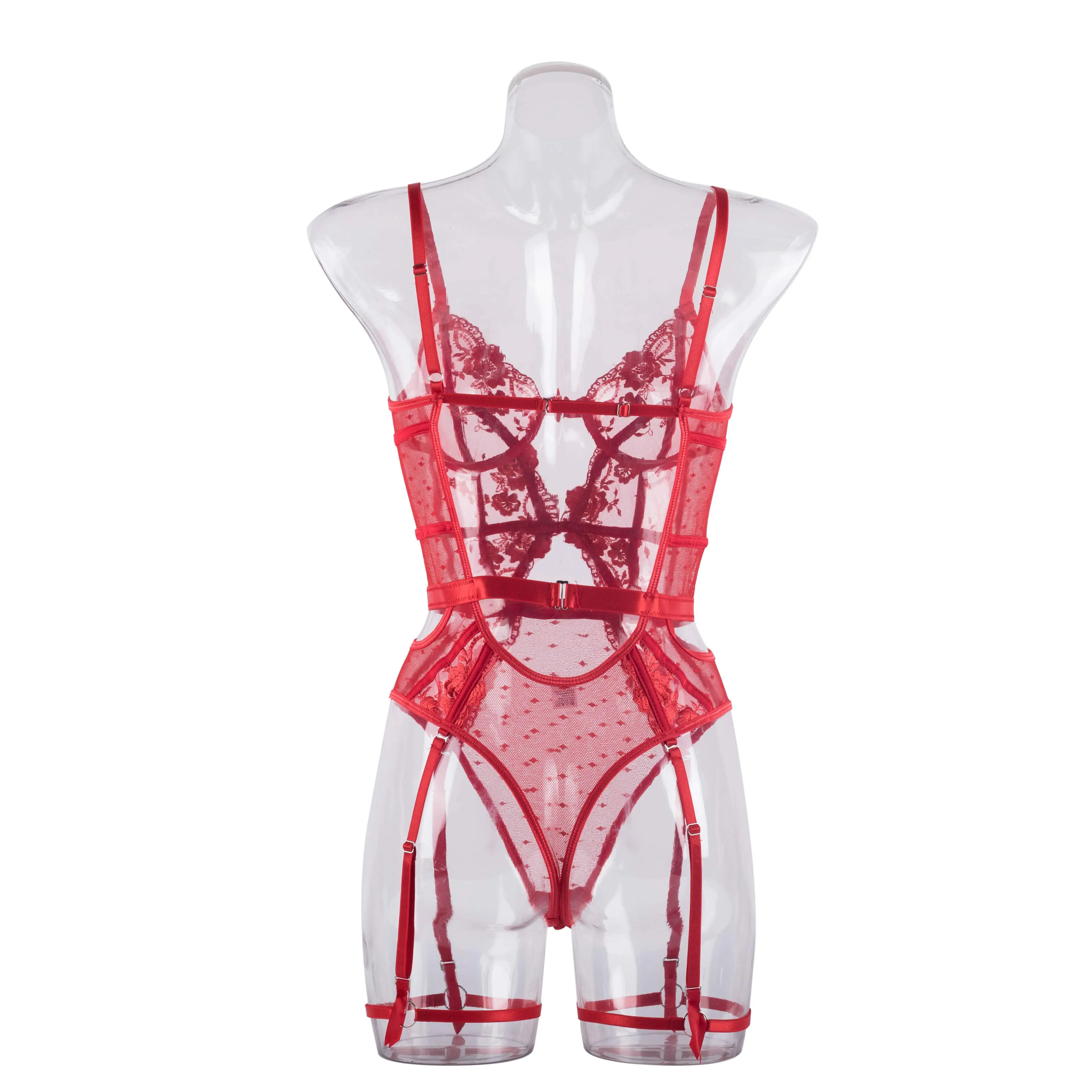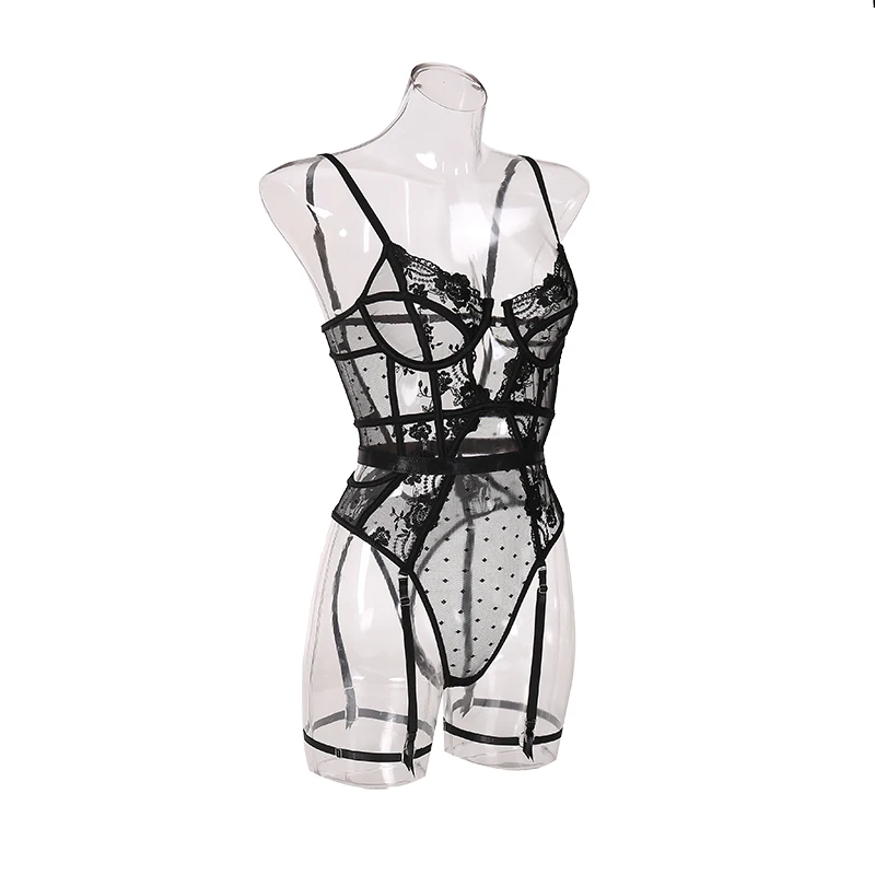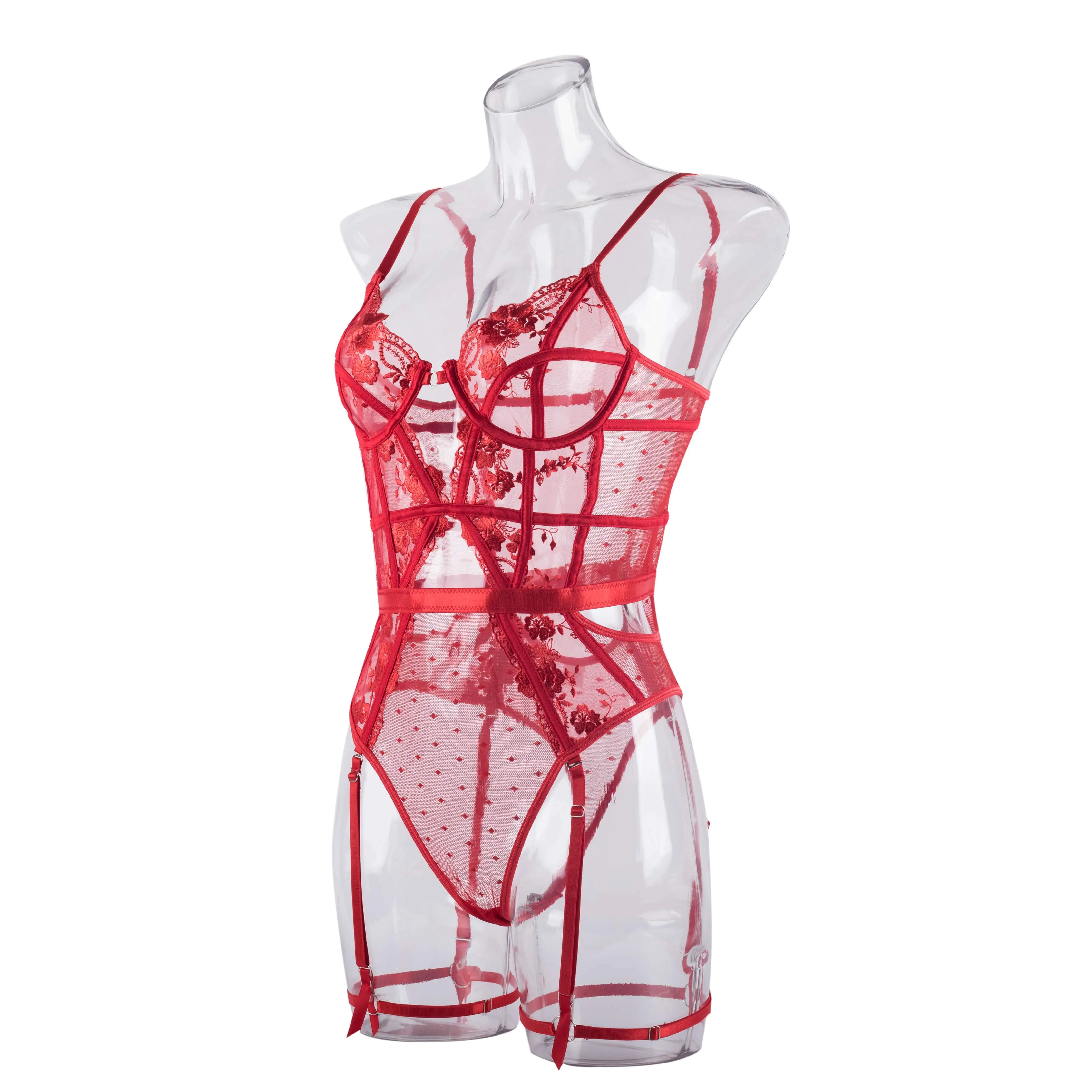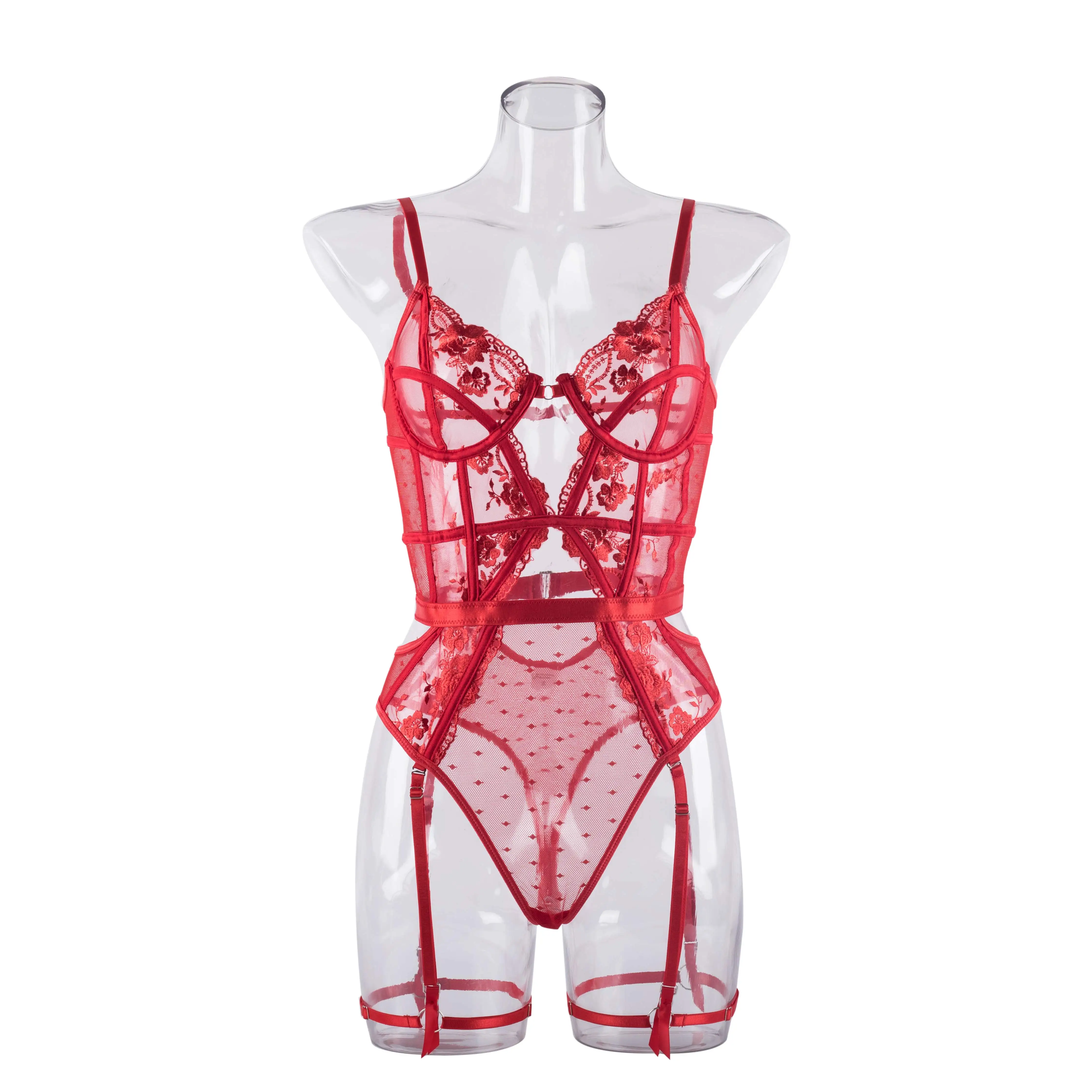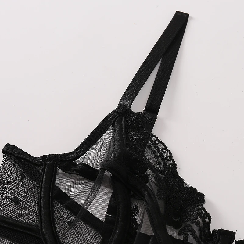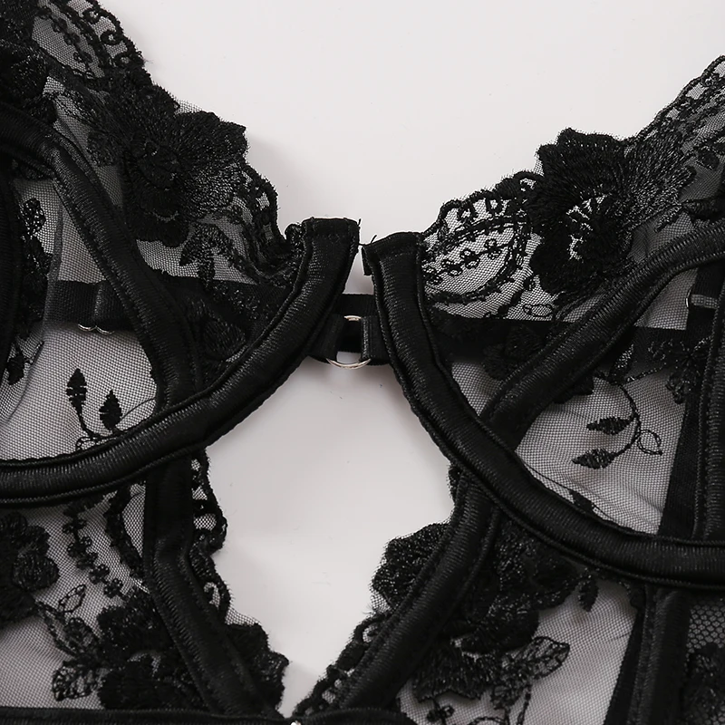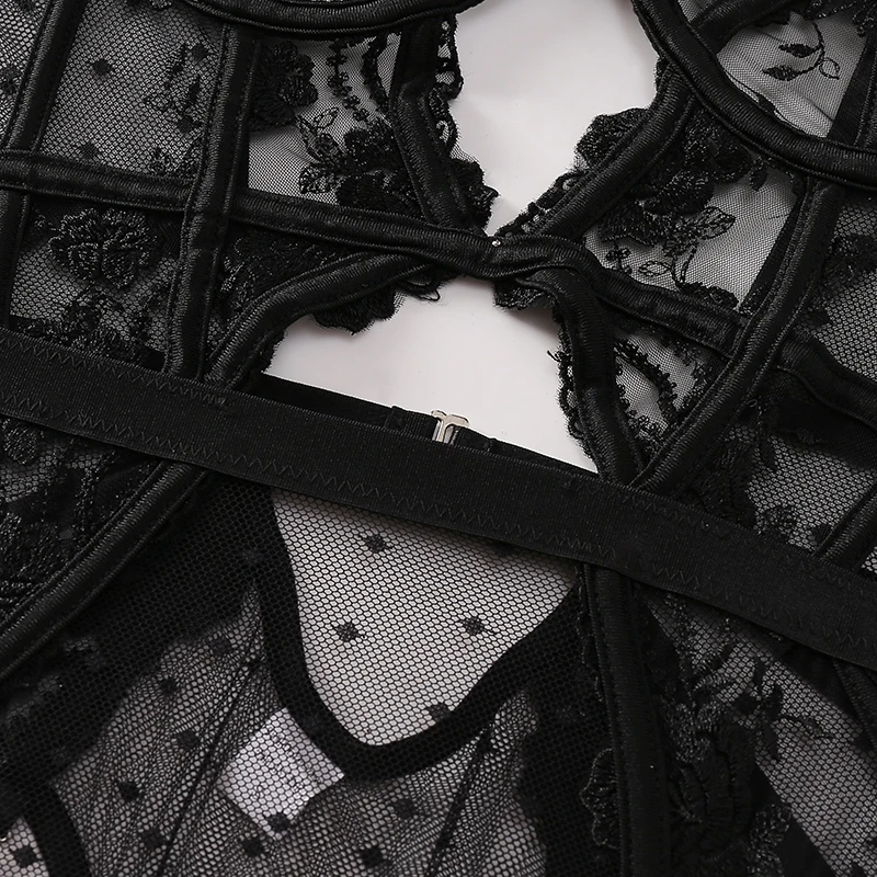 Sexy Lingerie for Women Lace Embroidery Jumpsuit Outfit Mesh Patchwork See-through Underwear Hollow Out Bra Garters Intimates