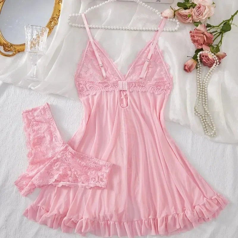 Sexy Lingerie Set Women Erotic Bra Nightdress Sexy Lace Sleepwear Solid Slim Soft Dresses V Neck Full Slip Sleepwear & Dresses