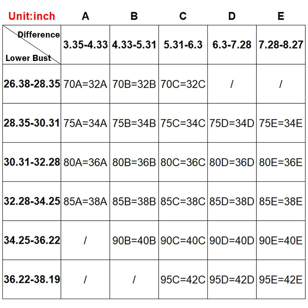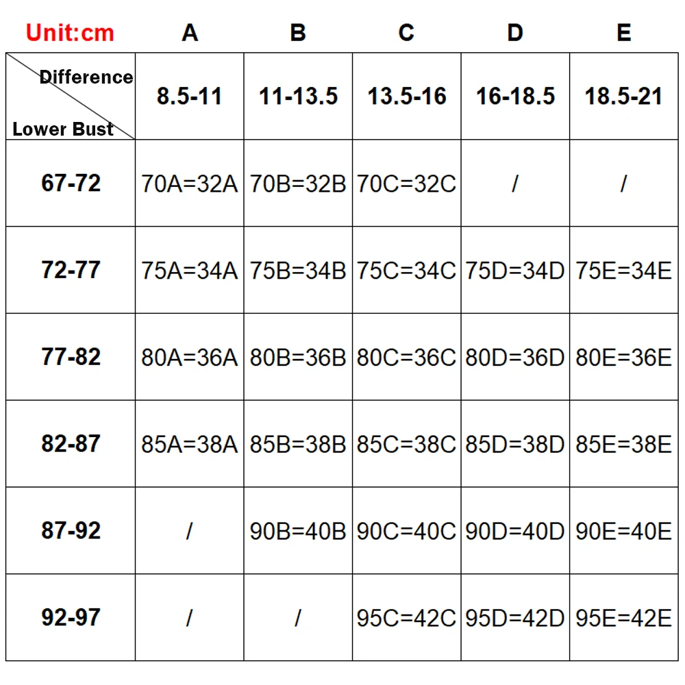 | Cup Size | 70B, 75A, 75B, 75C, 80B, 80C, 80D, 85B, 85C, 85D, 90B, 90C |