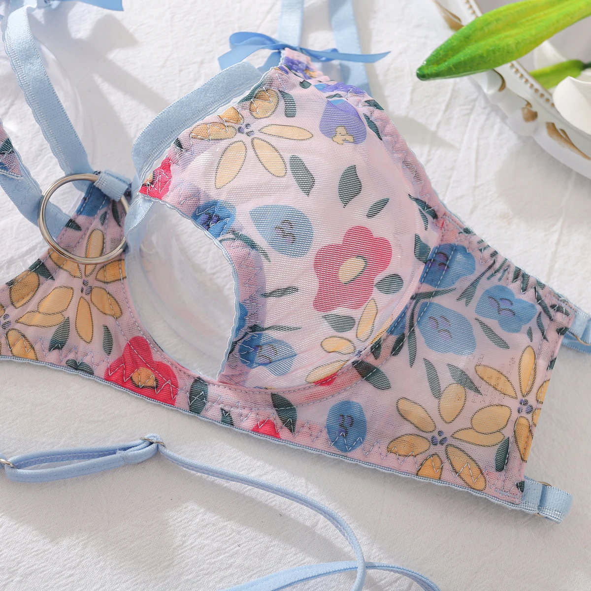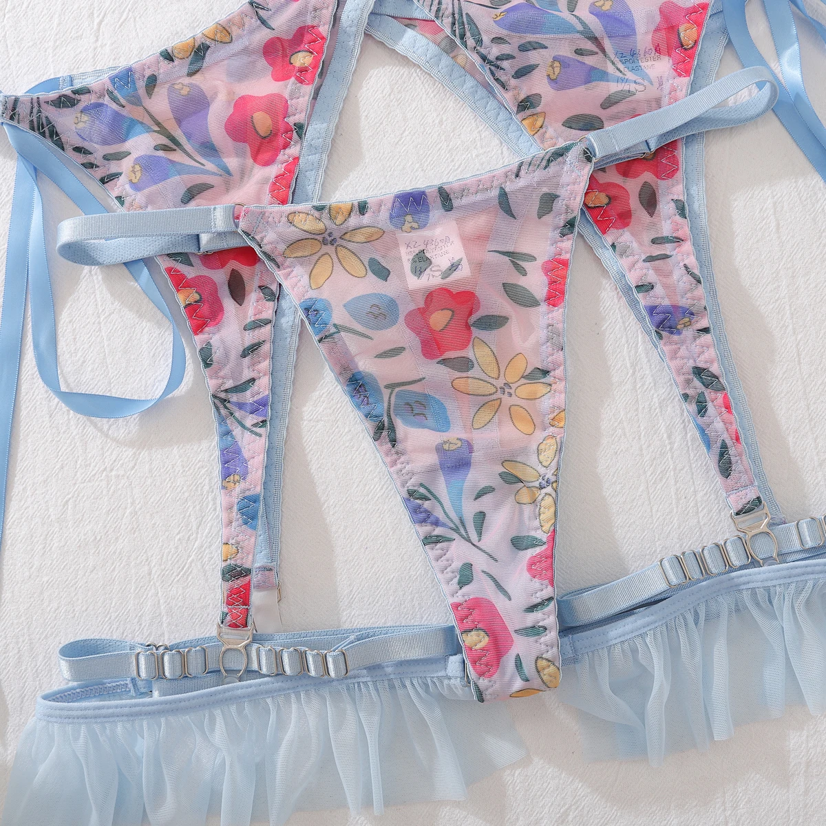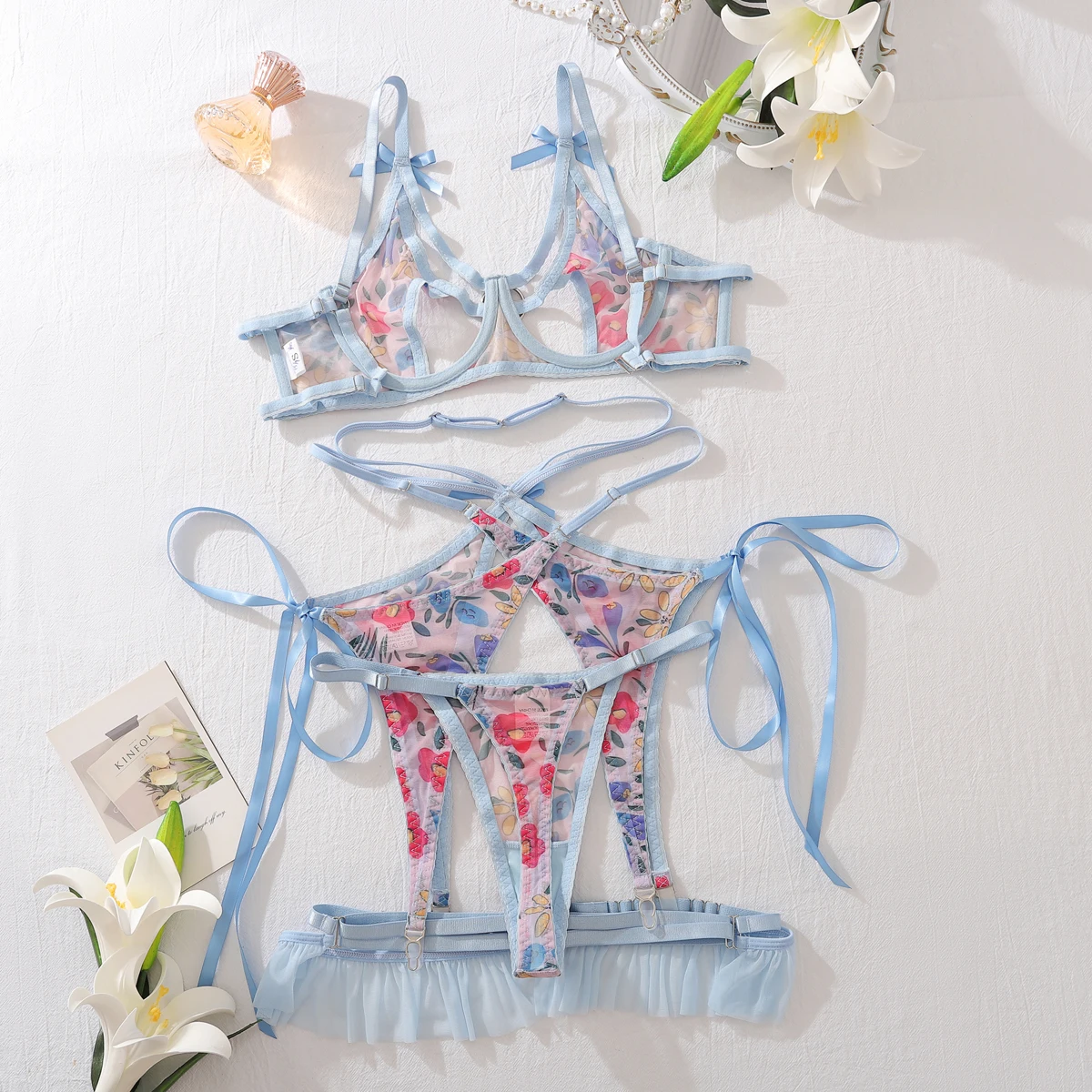Women’s Sexy Lingerie Vintage Flower Hollow Out Bra Fancy Garter Belt Matching Erotic Lingerie Exotic Set of Three
